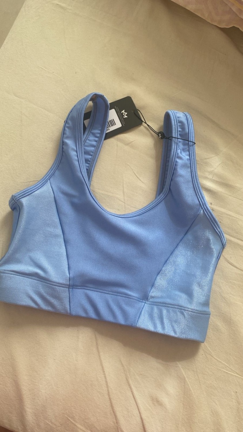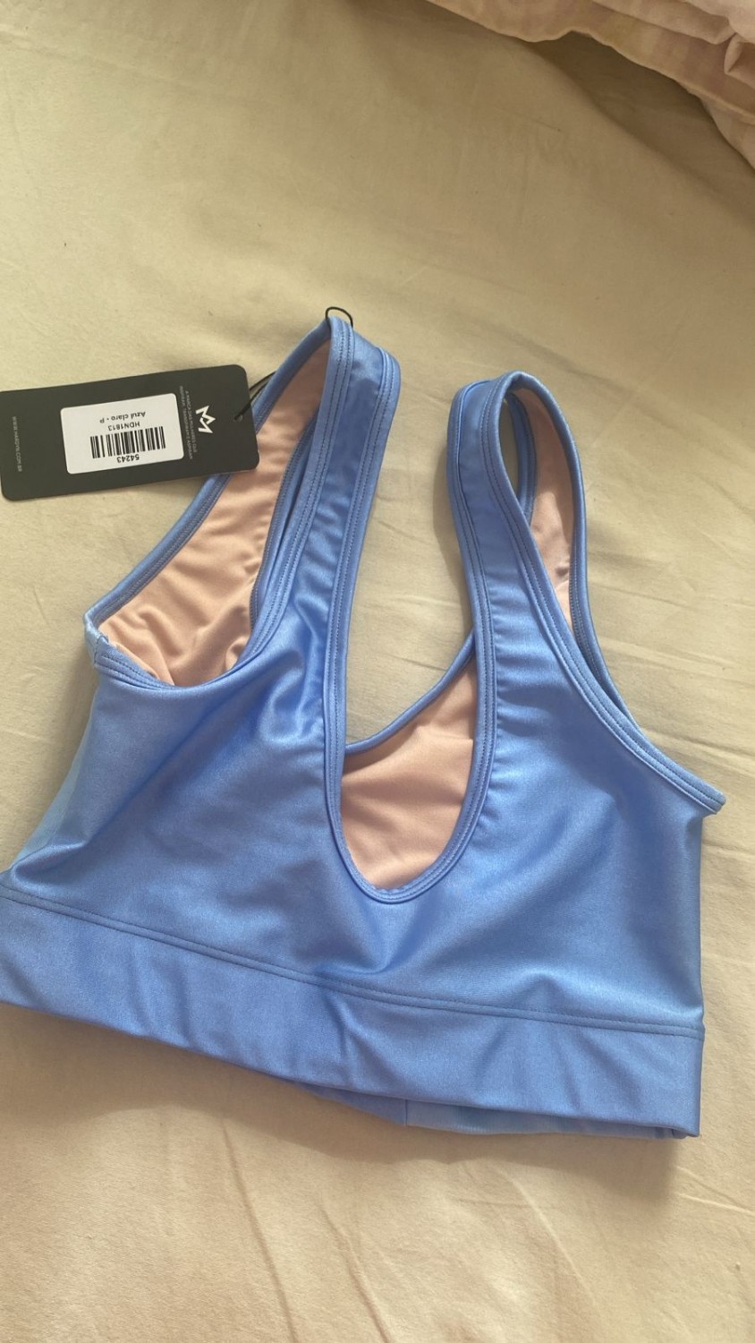Textura macia, alta elasticidade e acabamento brilhante sutil.TOP FITNESS EM POLIAMIDA AZUL CLARO
