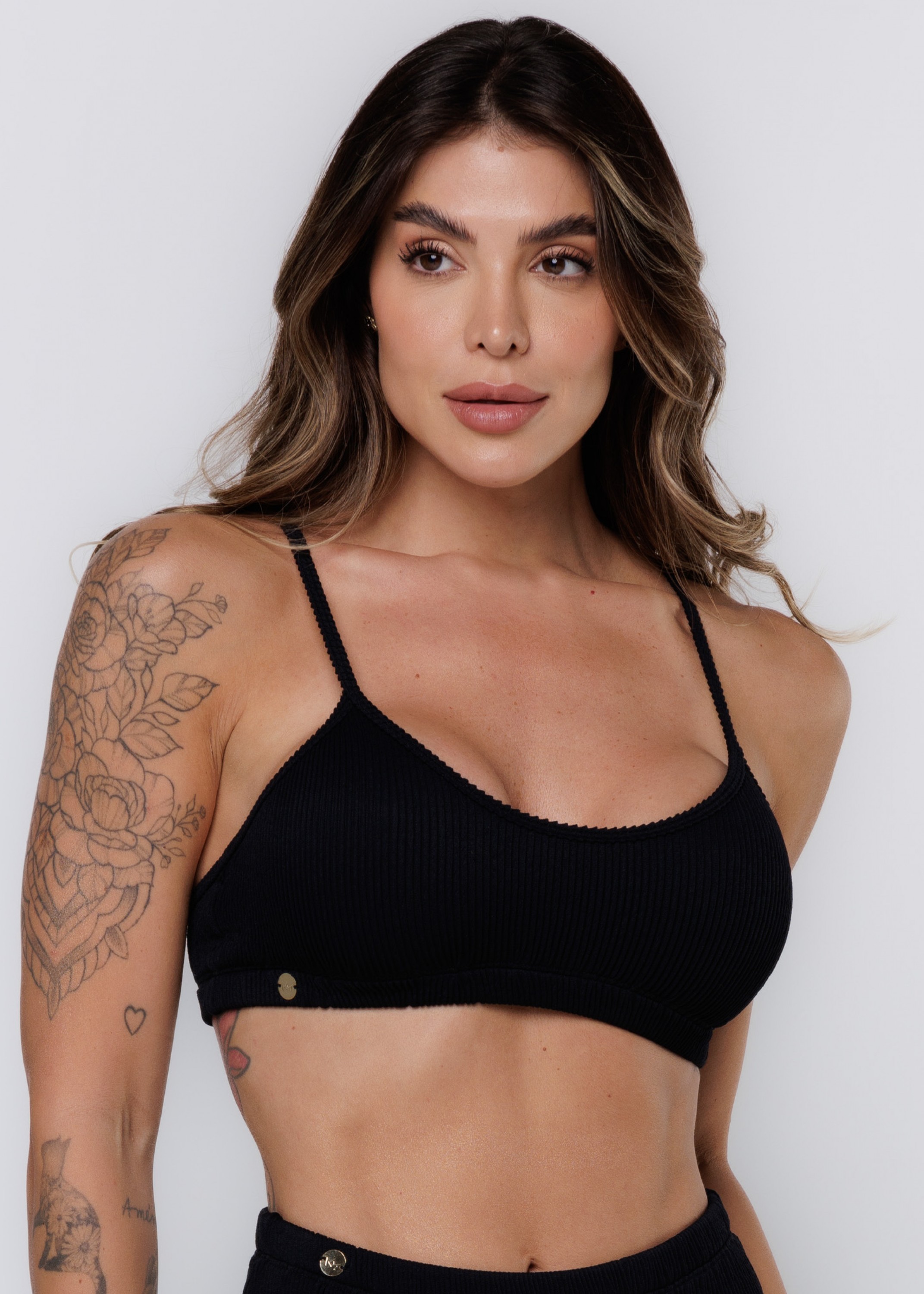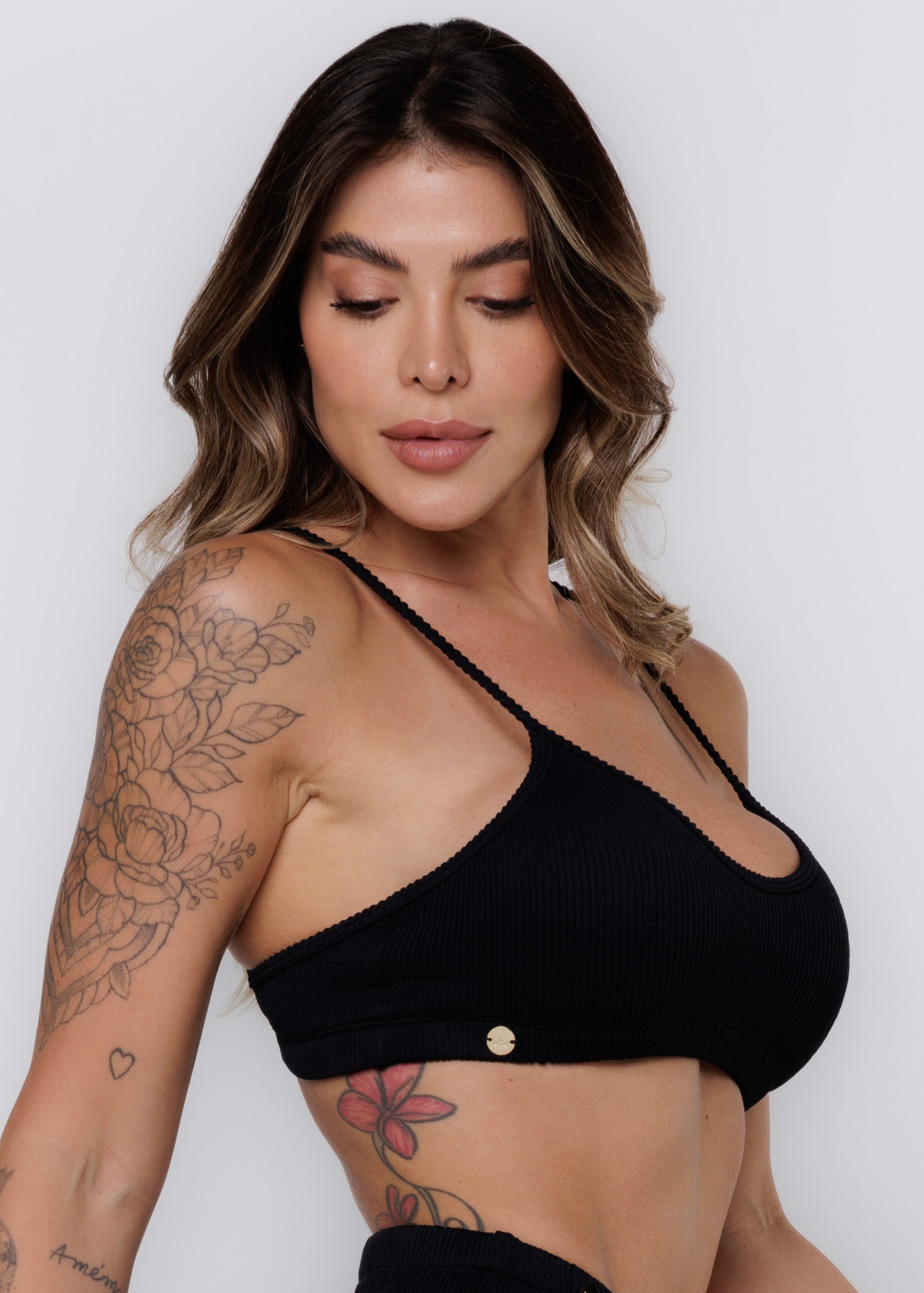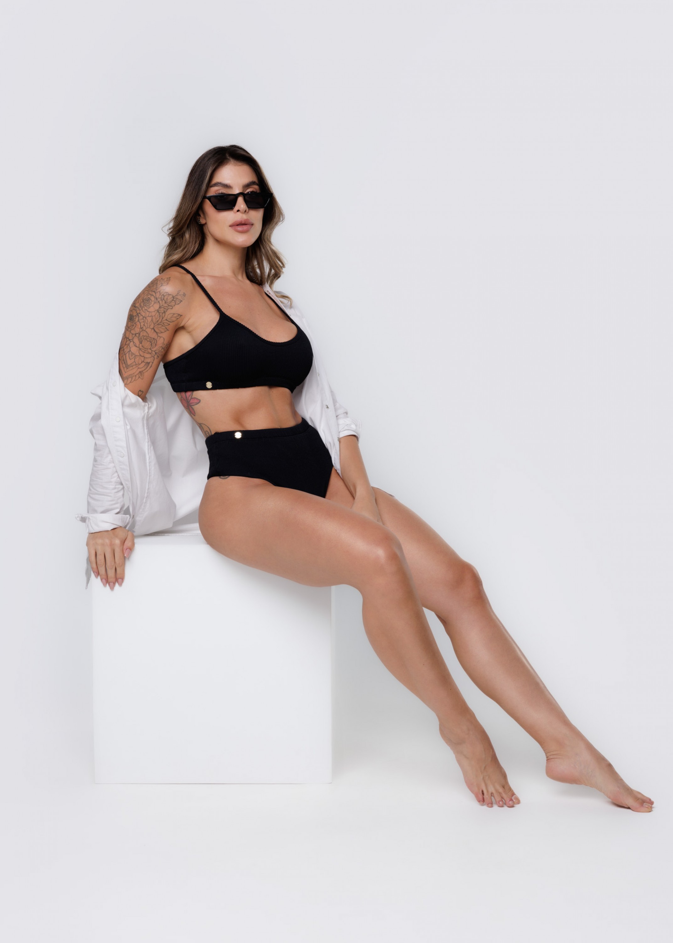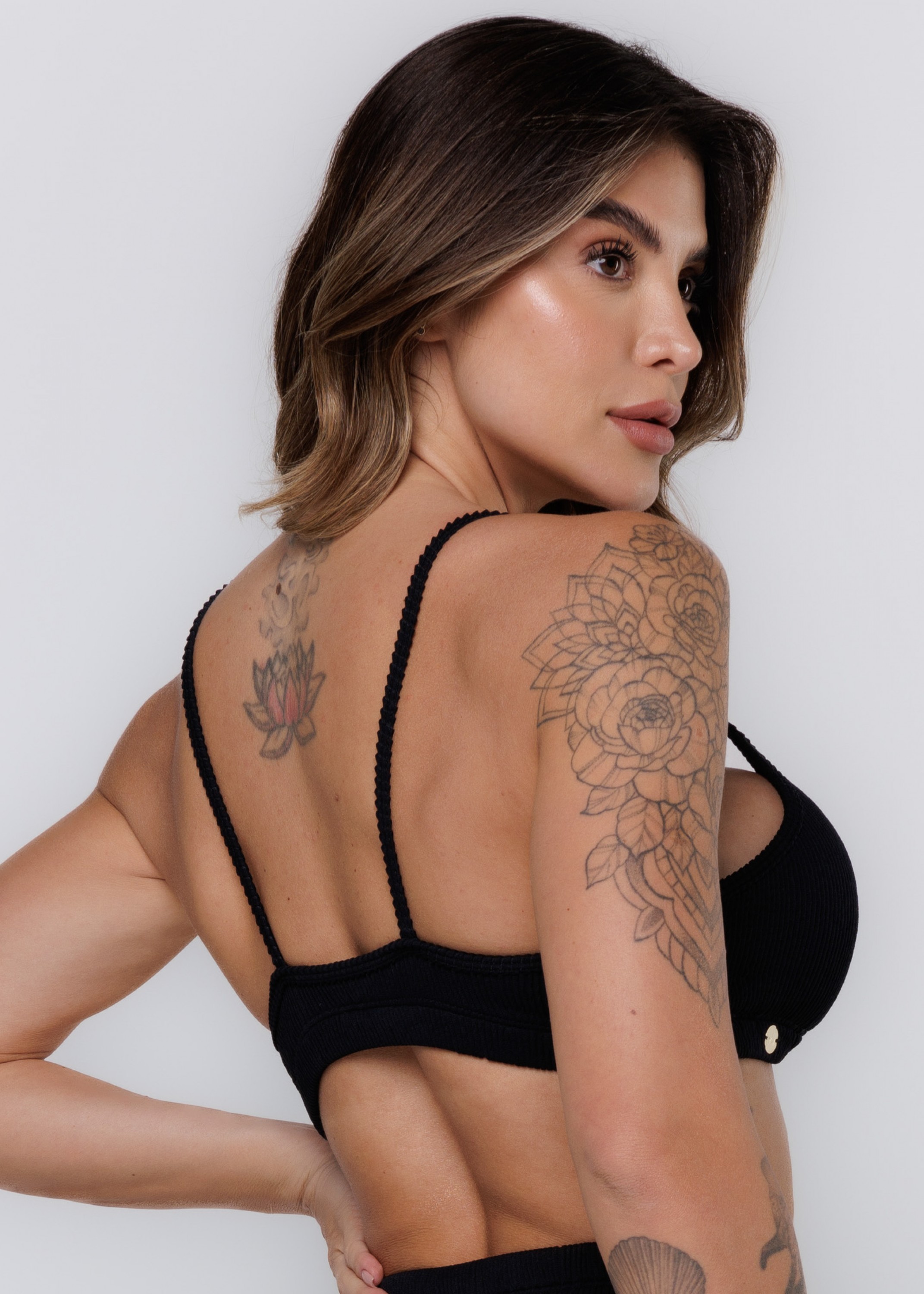 Protege a pele dos raios solares (UVA e UVB). Obs.: lembre-se: de usar protetor solar, a tecnologia não substitui o seu uso.TOP BIQUÍNI PRETO