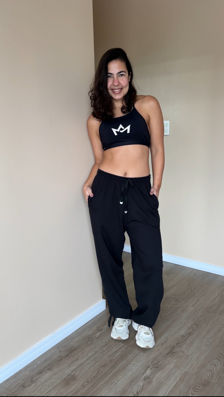 Carregue seus itens essenciais com conforto durante seu treino.CALÇA OVERSIZED DE MOLETINHO PRETA COM BOLSOS E CINTURA AJUSTÁVEL